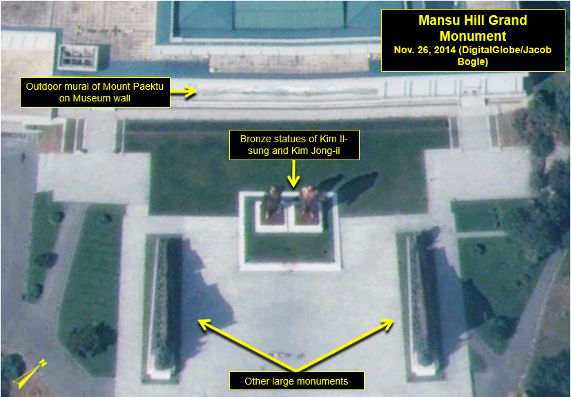 Figure 5: Image showing the newly installed statues of Kim Il-sung and Kim Jong-il at Mansu Hill. (Image Credit: Google Earth/DigitalGlobe, Nov. 26, 2014)